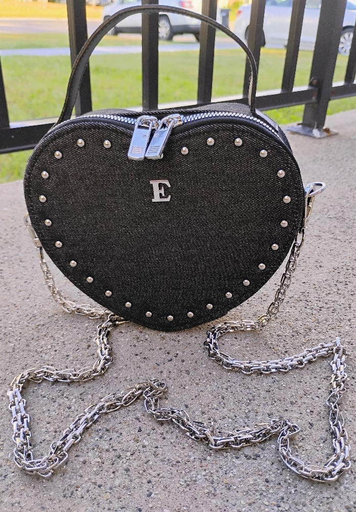 Denim Heart Shape Crossbody Bag with silver E and studs